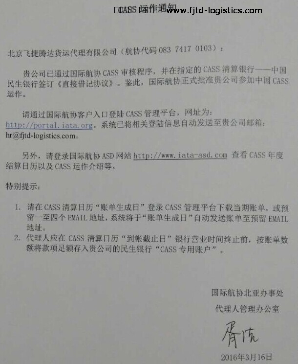 飛捷騰達(dá)國(guó)際航協(xié)CASS運(yùn)作通知