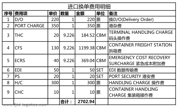不同貨代,進(jìn)口換單費(fèi)千差萬別。進(jìn)口貨代發(fā)給收貨人的對賬單上通常包括:換D/O費(fèi)、THC費(fèi)、數(shù)據(jù)傳輸費(fèi)、文件費(fèi)、港雜費(fèi)、港安費(fèi)、拆箱費(fèi)、操作費(fèi)等。有的貨代會(huì)給一個(gè)費(fèi)用明細(xì),有的貨代只給一個(gè)總費(fèi)用。給費(fèi)用明細(xì)的好理解,給總費(fèi)用的,作為收貨人一般都不知道具體有哪些費(fèi)用,更要命的是給一個(gè)總費(fèi)用不要緊,且費(fèi)用名稱就叫“換單費(fèi)”,這時(shí)候收貨人會(huì)被“嚇到”——換單費(fèi)怎么那么高?筆者就遇到國這種情況,結(jié)果一問,才知道所謂的換單費(fèi)竟然包括了如下一大堆費(fèi)用: