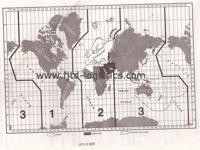 為了制定國際空運中運價的計算規(guī)則,國際航空運輸協(xié)會(IATA)把全球劃分為三個大的區(qū)域,及各大區(qū)下面又細分為多個小區(qū)域(次區(qū))。這樣劃分出的區(qū)域稱為“國際航空運輸協(xié)會運價協(xié)調(diào)區(qū)(IATA Traffic Conference Areas)”,簡稱IATA區(qū)域。