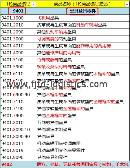 如:坐具(各種椅子、座椅)都?xì)w入94.01(第94章第1個(gè)品目,此品目描述為“坐具(包括能做床用的兩用椅,但品目94.02的貨品除外)及其零件”),坐具(94.01)主要根據(jù)“用途”和“材質(zhì)”進(jìn)一步細(xì)分: