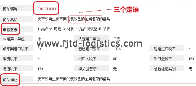 要特別注意其定語,如9401.7110.00,注意商品名稱(編碼描述)有好幾個(gè)定語(皮革或再生皮革面的、裝軟墊的、金屬框架的)