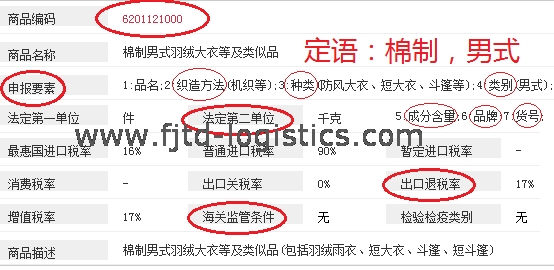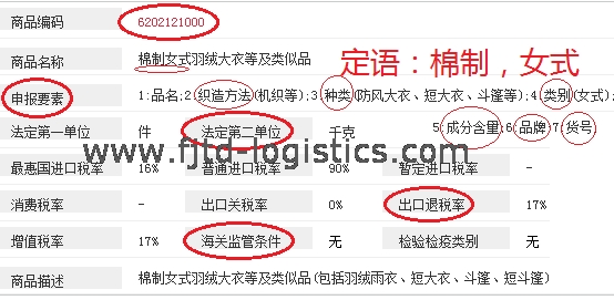 申報要素:織造方法(機(jī)織/梭織)、種類(羽絨服)、類別(女式)、成分含量(比如80%棉)、品牌、貨號。法定第一單位:件,法定第二單位:千克。
