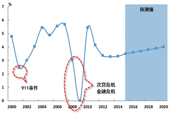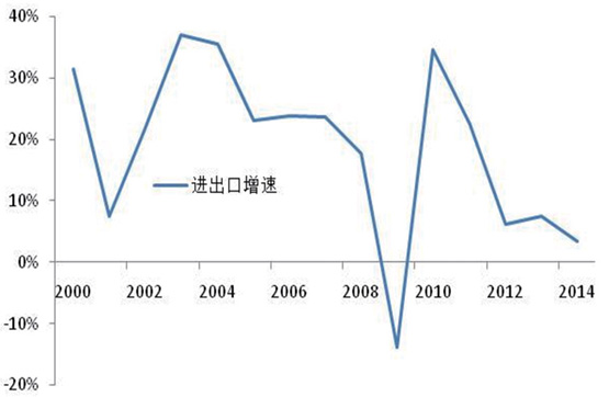 外貿(mào)保持穩(wěn)定增長(zhǎng),與經(jīng)濟(jì)彈性進(jìn)一步下降。在加入WTO的帶動(dòng)下,2000-2007年我國(guó)外貿(mào)進(jìn)出口總額保持了24.3%的年均增長(zhǎng)(如圖8所示),與 GDP的彈性系數(shù)高達(dá)2.25,明顯高出世界1.5的平均水平,成為世界重要經(jīng)貿(mào)大國(guó)。受到金融危機(jī)沖擊和全球貿(mào)易放緩的影響,面對(duì)國(guó)內(nèi)外復(fù)雜形勢(shì),2007-2014年我國(guó)對(duì)外貿(mào)易仍保持較快發(fā)展,外貿(mào)進(jìn)出口總額年均增速達(dá)到10.2%,國(guó)際貿(mào)易地位不斷提高,成為世界第一貨物貿(mào)易大國(guó)。隨著貿(mào)易依賴度的提高,進(jìn)出口彈性逐步下降,由2.25下降為1.16。“十三五”期間我國(guó)對(duì)外貿(mào)易發(fā)展將面臨更加復(fù)雜的國(guó)際環(huán)境,將逐步轉(zhuǎn)入平穩(wěn)發(fā)展階段,與 GDP的彈性下降為1.0,外貿(mào)進(jìn)出口總額增速保持在6.6%與GDP相當(dāng)?shù)乃健?br />  貿(mào)易區(qū)域結(jié)構(gòu)不斷優(yōu)化,貿(mào)易伙伴保持多元化趨勢(shì)。隨著我國(guó)經(jīng)濟(jì)社會(huì)發(fā)展水平的提高,貿(mào)易呈現(xiàn)多元化發(fā)展趨勢(shì),特別是金融危機(jī)后,亞洲、歐洲和北美洲占貿(mào)易比重由2007年的89.6%逐步降為2014年的85.1%,美國(guó)、歐盟和日本所占比重由41.1%降為34.4%,而非洲、拉丁美洲所占貿(mào)易比重則由 8.1%上升為11.3%。隨著世界貿(mào)易格局的調(diào)整,以及我國(guó)“一帶一路”戰(zhàn)略的推進(jìn),對(duì)外貿(mào)易結(jié)構(gòu)將進(jìn)一步優(yōu)化,與東盟、非洲等海上絲綢之路沿線國(guó)家貿(mào)易比重進(jìn)一步上升。