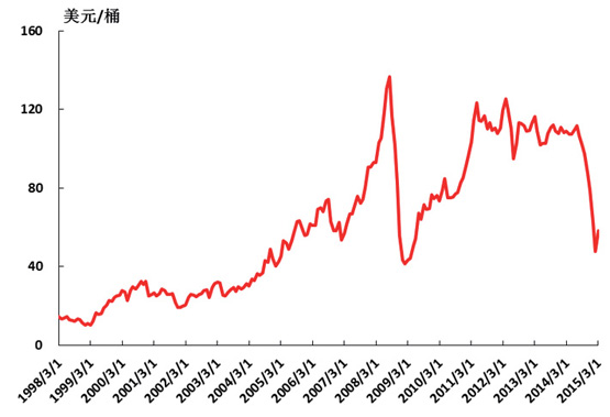 大宗資源類價(jià)格進(jìn)入一輪低谷。在上一輪世界經(jīng)濟(jì)快速增長(zhǎng)的帶動(dòng)下,對(duì)石油、鐵礦石等資源類商品需求快速增長(zhǎng),天平向供給方傾斜,推動(dòng)了資源價(jià)格大幅度上漲(如圖3和圖4所示),同時(shí)也刺激資本對(duì)資源開(kāi)發(fā)、生產(chǎn)投入大幅度增長(zhǎng)。在世界經(jīng)濟(jì)增速放緩、生產(chǎn)率效率持續(xù)提高和日益注重節(jié)能減排的背景下,需求減弱,而產(chǎn)出穩(wěn)定增長(zhǎng),供需關(guān)系出現(xiàn)了失衡,天平向需求方傾斜,資源價(jià)格開(kāi)始大幅下跌。石油價(jià)格一度跌至40多美元,中國(guó)鐵礦石到岸價(jià)也跌至60-70美元的水平(如圖3和圖4所示)。從多個(gè)機(jī)構(gòu)的預(yù)測(cè)來(lái)看,今后一個(gè)時(shí)期大宗商品價(jià)格很難有大幅提升。