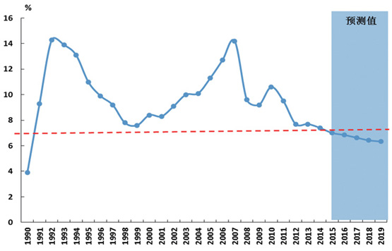 經(jīng)濟(jì)進(jìn)入中速增長(zhǎng)階段。圖5顯示了1990年以來(lái)我國(guó)經(jīng)濟(jì)增速的變化。2000-2010年我國(guó)經(jīng)濟(jì)、對(duì)外貿(mào)易分別保持了年均10.5%和20.2%的增長(zhǎng),2010年后呈現(xiàn)逐步放緩態(tài)勢(shì),2014年降為7.4%。當(dāng)前,我國(guó)經(jīng)貿(mào)發(fā)展面臨十分復(fù)雜的國(guó)際環(huán)境,內(nèi)部則處于“三期”疊加期。隨著新型工業(yè)化、信息化、農(nóng)業(yè)現(xiàn)代化和城鎮(zhèn)化“新四化”的不斷推進(jìn),以及市場(chǎng)機(jī)遇、投資機(jī)遇、綠色機(jī)遇和對(duì)外合作機(jī)遇的不斷擴(kuò)大,為我國(guó)經(jīng)濟(jì)增長(zhǎng)提供了巨大潛力和回旋空間。這些發(fā)展環(huán)境變化使我國(guó)經(jīng)濟(jì)發(fā)展進(jìn)入新常態(tài),預(yù)計(jì)2015年GDP增長(zhǎng)約7%,“十三五”期間經(jīng)濟(jì)平均增速只要保持在6.6%(如圖5所示),即可實(shí)現(xiàn) 2020年GDP總量比2010年翻一番的戰(zhàn)略目標(biāo),按照人均GDP水平測(cè)算,我國(guó)將進(jìn)入高收入國(guó)家行列,對(duì)海運(yùn)需求質(zhì)量將全面提高。