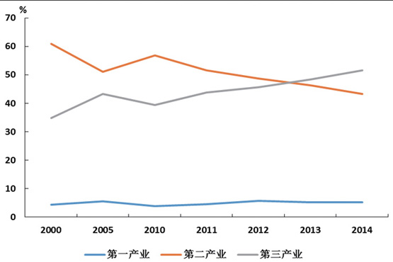產(chǎn)業(yè)與區(qū)域經(jīng)濟(jì)結(jié)構(gòu)調(diào)整,第三產(chǎn)業(yè)成為經(jīng)濟(jì)增長(zhǎng)的主要?jiǎng)恿?。隨著經(jīng)濟(jì)社會(huì)的進(jìn)步,經(jīng)濟(jì)結(jié)構(gòu)不斷優(yōu)化,第三產(chǎn)業(yè)所占比重逐步提高,并于2013年首次超過(guò)第二產(chǎn)業(yè)(如圖6所示)。未來(lái),經(jīng)濟(jì)將進(jìn)入中速增長(zhǎng)階段,而第三產(chǎn)業(yè)可望保持相對(duì)較快的增長(zhǎng),占GDP比重持續(xù)提高,結(jié)構(gòu)不斷優(yōu)化。從三駕馬車的貢獻(xiàn)來(lái)看,外貿(mào)和投資的作用逐漸減弱,經(jīng)濟(jì)增長(zhǎng)主要依托消費(fèi)的增長(zhǎng)。消費(fèi)的增長(zhǎng)并不能像第二產(chǎn)業(yè)那樣直接拉動(dòng)運(yùn)輸需求量的增長(zhǎng),這一態(tài)勢(shì)使得運(yùn)輸需求對(duì)GDP增速?gòu)椥詼p弱。