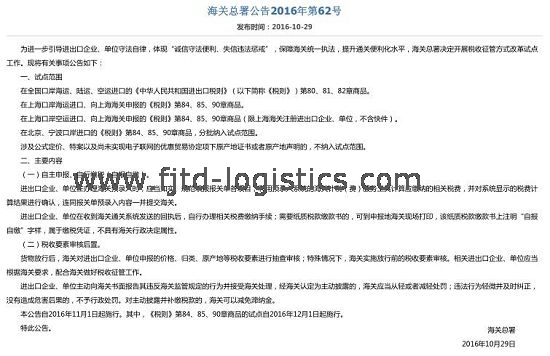 10月30日消息,昨日,海關(guān)總署發(fā)布《海關(guān)總署公告2016年第62號》,將開展稅收征管方式改革試點工作。該公告將于2016年11月1日起正式施行,《中華人民共和國進出口稅則》(以下簡稱《稅則》)第84、85、90章商品的試點自2016年12月1日起施行。