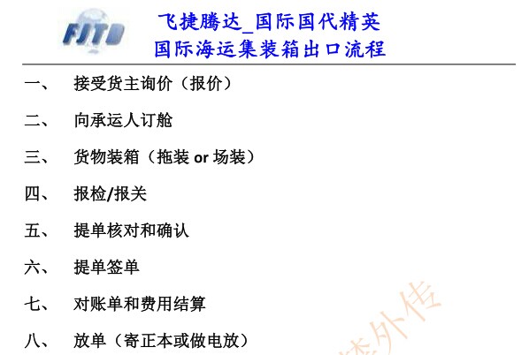 導(dǎo)讀:本文就國(guó)際海運(yùn)集裝箱出口的一般流程做一個(gè)簡(jiǎn)單的總結(jié),供貨代人參考。實(shí)際操作中,還會(huì)涉及到很多環(huán)節(jié)和細(xì)節(jié),需要注意的地方很多,本文只列出了一個(gè)大致的流程。做國(guó)際海運(yùn)出口的貨代朋友們,請(qǐng)進(jìn)一步學(xué)習(xí),爭(zhēng)取早日成為國(guó)際貨代精英,加油哦!
