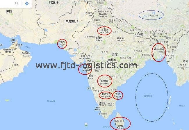 印度的Bombay(孟買)、Nhava Sheva(孟買新港/那瓦舍瓦)、Madras(馬德拉斯)——現(xiàn)在叫Chennai(金奈)、Calcutta(加爾各答)、New Delhi(新德里);巴基斯坦的Karachi(卡拉奇);孟加拉國的Chittagong(吉大港);斯里蘭卡的Colombo(科倫坡)等。以上港口為各個(gè)國家的基本港。