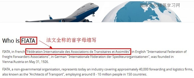 國(guó)際貨運(yùn)代理協(xié)會(huì)聯(lián)合會(huì)的英文全稱(chēng)為International Federation of Freight Forwarders Associations;法文全稱(chēng)為Fédération Internationale des Associations de Transitaires et Assimilés——簡(jiǎn)稱(chēng)FIATA——FIATA是這個(gè)組織的法文全稱(chēng)的首字母縮寫(xiě)。