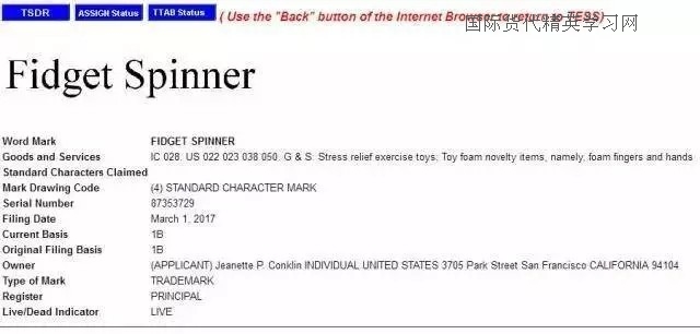 指尖陀螺(fidget spinner) 在美國的發(fā)明專利原型已失效,而外觀與發(fā)明都已不存在新穎性,   而在歐盟已有人申請了外觀專利,但是商標方面已經(jīng)陸續(xù)在中美歐等國都正在申請中,尚未核準注冊。