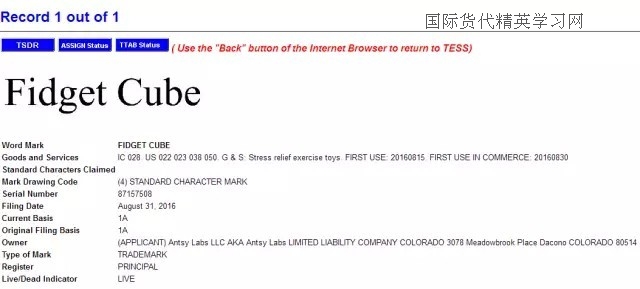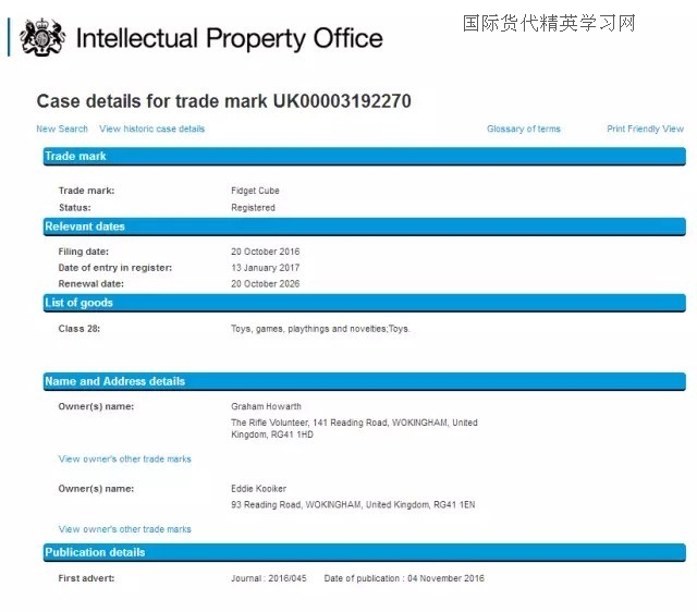 最后,減壓魔方(Fidget Cube),小編查到中國關(guān)于fidget cube 商標注冊情況時,瞬間驚呆!從去年11月份到今年1月份,一共有4位申請人提交了fidget cube 申請28類,歐盟和美國也有申請,同一申請人ANTSY Labs. LLC,由此,小編推斷,這款魔方的發(fā)明者很有可能就是這家美國公司,也有可能申請了美國的外觀和發(fā)明!也是在去年下半年,是一名英國人向英國商標局提交了fidget cube 28類的商標申請。截至目前,fidget cube就是在日本沒有檢索到相同的商標申請,但是,日本的商標檢索盲期也有2-3個月,因此,也很難說在3月份到現(xiàn)在是否有人提交了fidget cube 的商標申請!
