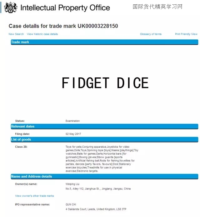 方信小編順手研究了一下相關(guān)還有沒有類似的商標, 結(jié)果還發(fā)現(xiàn)了一個減壓骰子(fidget dice),就在前幾天,來自江蘇省的朋友向英國商標局申請了fidget dice 28類商標。
