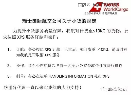 為提升小貨服務(wù)質(zhì)量保障,我航對(duì)計(jì)費(fèi)重≤10KG的貨物,要求按照XPS(快件)服務(wù)訂艙和操作: