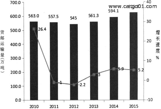 圖1 2010年~2015年民航貨郵運(yùn)輸量