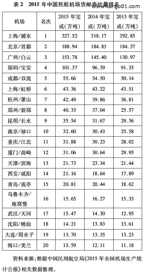 近年來(lái),民航局和各級(jí)政府進(jìn)一步加快航空物流基礎(chǔ)設(shè)施建設(shè),中國(guó)機(jī)場(chǎng)數(shù)量不斷增加,機(jī)場(chǎng)規(guī)模不斷擴(kuò)張。2010年,機(jī)場(chǎng)系統(tǒng)完成固定資產(chǎn)投資總額441.5億元。2013年,機(jī)場(chǎng)系統(tǒng)完成的固定資產(chǎn)投資總額達(dá)到507.5億元。截止到2015年,我國(guó)大陸共有民用航空機(jī)場(chǎng)210個(gè),其中定期航班通航機(jī)場(chǎng)206個(gè),定期航班通航城市204個(gè)[4]。機(jī)場(chǎng)貨郵吞吐量逐步集中于少數(shù)機(jī)場(chǎng),上海、北京和廣州三大城市機(jī)場(chǎng)的樞紐作用已日益顯現(xiàn)。2015年,共51個(gè)機(jī)場(chǎng)的年貨郵吞吐量達(dá)萬(wàn)噸以上,其貨郵吞吐量與全國(guó)機(jī)場(chǎng)貨郵吞吐量相比,占比達(dá)到98.4%,北京、上海和廣州機(jī)場(chǎng)的貨郵吞吐量占比達(dá)到50.9%。其中,上海浦東國(guó)際機(jī)場(chǎng)的貨運(yùn)吞吐量位居全球第三位。2015年中國(guó)民航機(jī)場(chǎng)貨郵吞吐量排名見(jiàn)表2。