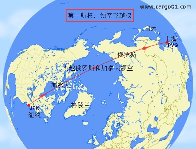 比如:上海(PVG)一 紐約(JFK),中途飛越俄羅斯和加拿大領(lǐng)空,那就要和俄羅斯和加拿大簽訂領(lǐng)空飛越權(quán),獲取第一航權(quán),否則只能繞道飛行,增加燃料消耗和飛行時(shí)間。有人可能會(huì)問(wèn):上海飛紐約不是飛越太平洋嗎?怎么會(huì)飛越俄羅斯和加拿大?因?yàn)榈厍蚴乔蝮w,上海到紐約飛“北極航線”距離最短,所以有的航班是這樣飛的。