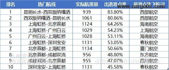 (七)中國(guó)大陸:熱門(mén)航線準(zhǔn)點(diǎn)率TOP10