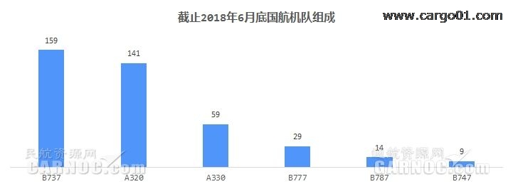 截止2018年6月底,國航客運飛機總數(shù)411架,占國內機隊總數(shù)的12.8%;截止2018年6月底,國航B737,A320數(shù)量最多,分別為159架、141架。