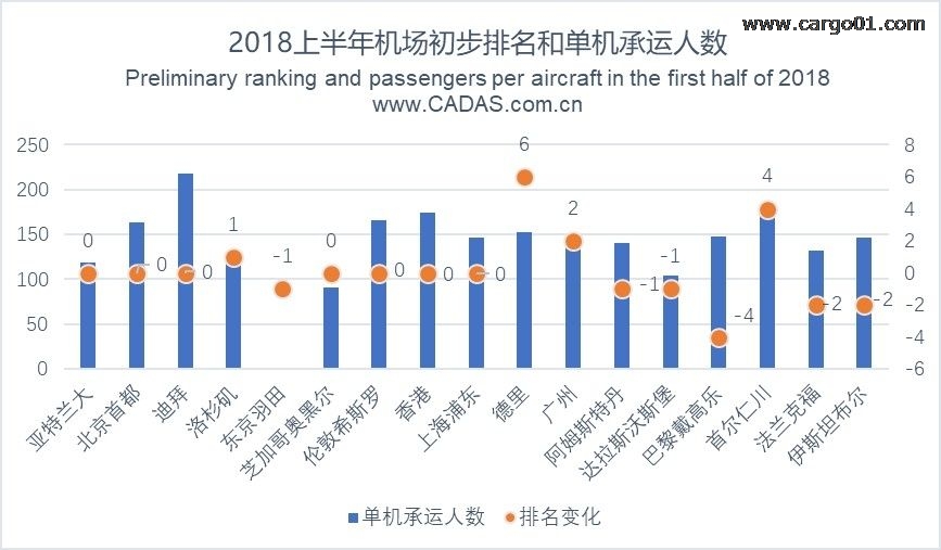 從起降架次方面觀察,德里機(jī)場(chǎng)飛機(jī)起降架次同樣增速最快,同比增長(zhǎng)10.66%。旅客吞吐量最高的亞特蘭大機(jī)場(chǎng)的起降架次最多,其次為芝加哥奧黑爾機(jī)場(chǎng)。德里機(jī)場(chǎng)旅客吞吐量初步排名上升6位最多,由2017年第16位躋身第10位。同樣增速較快的首爾機(jī)場(chǎng)排名也由第19位上升第15位。而伊斯坦布爾機(jī)場(chǎng)旅客吞吐量同比增速達(dá)12.75%較高,但其旅客吞吐量排名由第15位下滑至第17位。法蘭克福機(jī)場(chǎng)旅客吞吐量排名由第14位下滑至第16位,巴黎戴高樂(lè)機(jī)場(chǎng)由第10位下滑至第14位,北京首都機(jī)場(chǎng)、香港機(jī)場(chǎng)、上海浦東機(jī)場(chǎng)仍保持2017年排名,分別位居第2、8、9位,廣州機(jī)場(chǎng)則由第13位上升第11位。通過(guò)觀察單機(jī)承運(yùn)人數(shù)方面,迪拜機(jī)場(chǎng)的單機(jī)承運(yùn)人數(shù)最高,其次為首爾機(jī)場(chǎng)、香港機(jī)場(chǎng),可以看出這些機(jī)場(chǎng)對(duì)時(shí)刻的利用更充分(時(shí)刻發(fā)揮更大“效益”)。