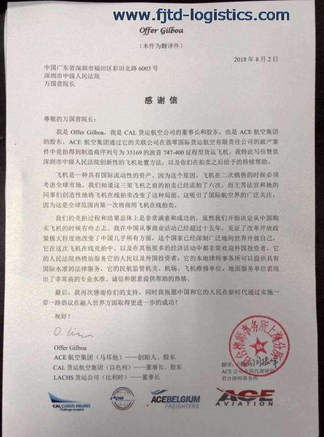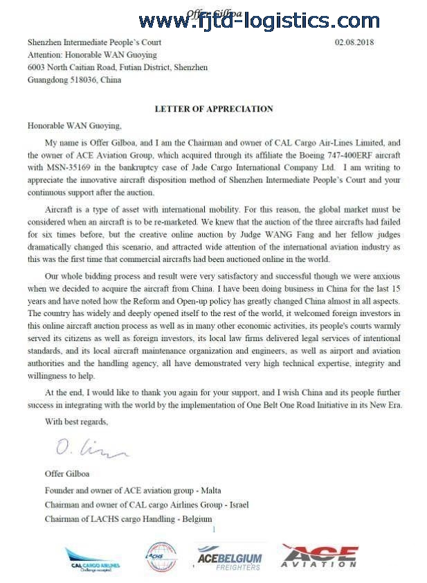 深圳中院創(chuàng)新的網(wǎng)拍模式,獲得了飛機競買人ACE航空集團創(chuàng)始人、股東Offer Gilboa先生的肯定和感謝。對此,Offer Gilboa先生專門發(fā)來感謝信。